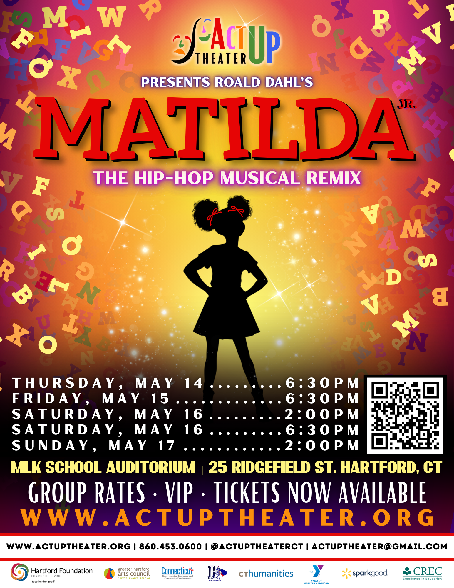 ActUp Theater is excited to invite your school to a special daytime student matinee of Matilda the Musical Jr. with a Hip Hop Remix on Friday, May 15 at 10:00 AM. ActUp Theater, Inc. is a Connecticut-based 501(c)(3) nonprofit dedicated to arts education, youth development, and equitable access to live theater. We are celebrating a decade of mobilizing the power of the arts in our community.